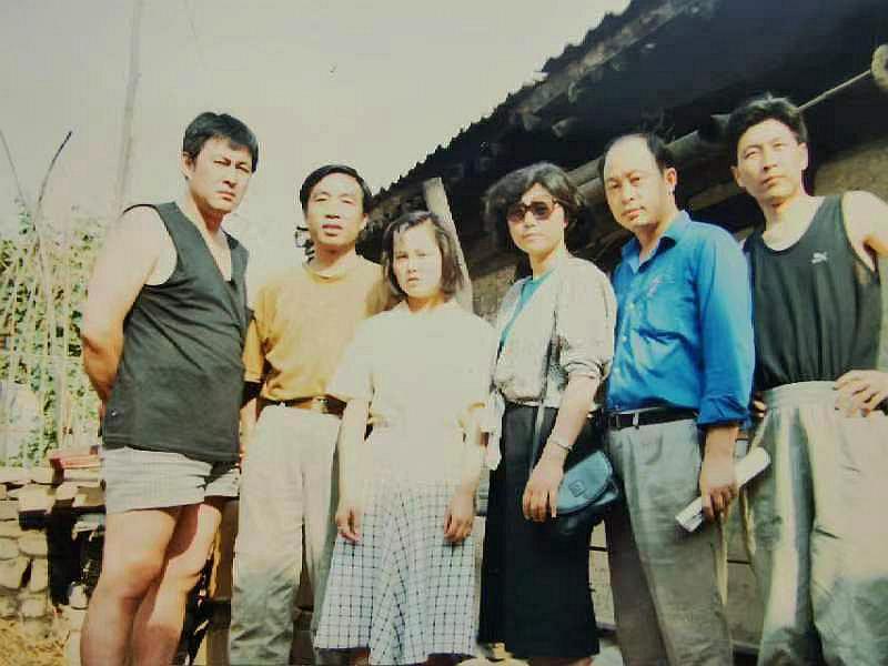 在陜北宜川縣訪問《蒼涼青春》人物二萬子的原型二纏子(前排右一)、北京女知青王村鈺的原型王春英(前排右二)、嚴彬(后排左一)、陸樹銘(后排左二)、雷鐵流(后排右一)王逸虹(前排左一)白描(前排左二)