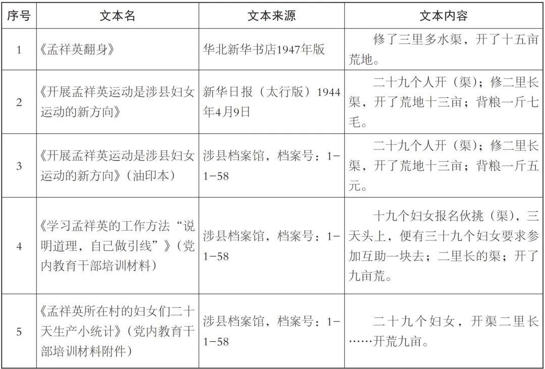 這份表格整理了涉及孟祥英與太倉(cāng)村婦救主任之間交往的各類文本,包括文學(xué)作品、公開報(bào)道與政府文書,在文本生成時(shí)間序列上由近及遠(yuǎn),相互影響,在文本等級(jí)與流通范圍上由高到低、由廣到狹,在文本細(xì)節(jié)上,也表現(xiàn)出由略到詳?shù)奶攸c(diǎn)[35]。觀察表格,我們可以意識(shí)到:從數(shù)據(jù)上看,公開報(bào)道并不比文學(xué)作品來得精確,政府文書也并不比公開報(bào)道更權(quán)威。材料3是由涉縣建設(shè)科保存的報(bào)道油印件,剛好是公開報(bào)道材料2的“底本”,對(duì)比可知,公開報(bào)道對(duì)部分?jǐn)?shù)據(jù)做了改動(dòng)。材料5與材料4來源于同一份保存在涉縣檔案館的干部培訓(xùn)材料,材料5作為材料4的附件出現(xiàn)。這意味著哪怕是兩份由相同筆跡抄寫、油印的材料,只因文件在形成時(shí)間與來源方面的差異,就提供了完全不同的數(shù)據(jù)。各類文本在數(shù)據(jù)層面的分歧清楚地向我們呈現(xiàn)出:在文本復(fù)制的過程中,數(shù)據(jù)往往并不穩(wěn)定,反倒是以婦救主任的轉(zhuǎn)變論證孟祥英工作方法之正確性的敘事模式得以毫無損耗地流傳下來。也就是說,與生產(chǎn)經(jīng)驗(yàn)相比,敘事模式反而是更值得繼承的面向。
