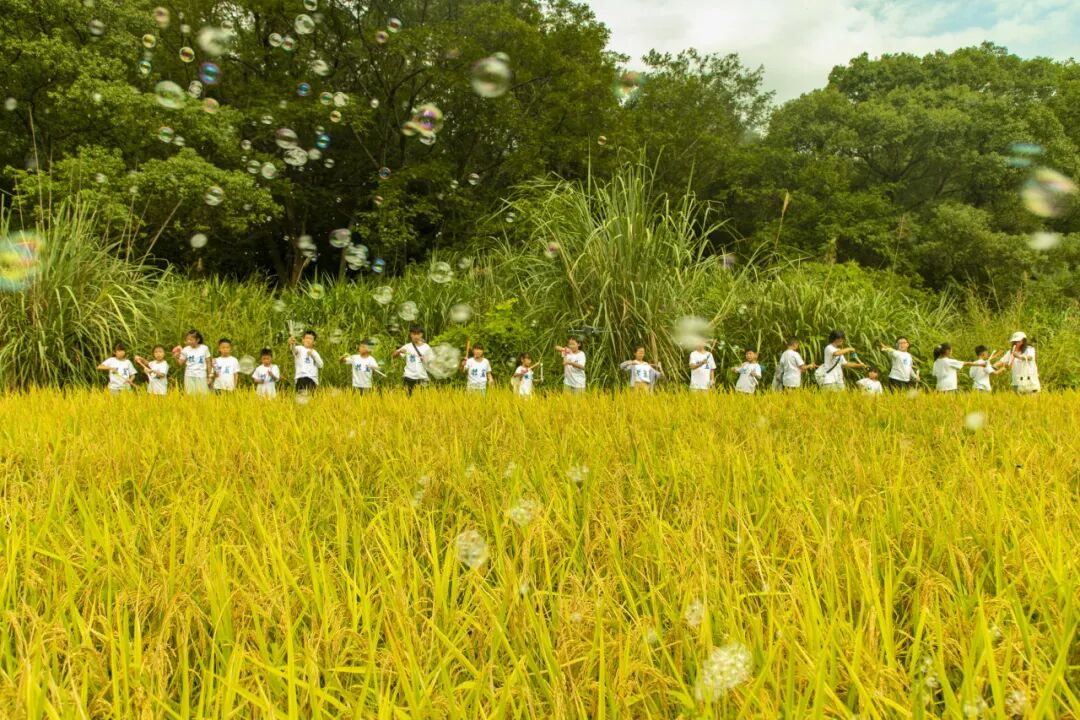 《搖籃》寶寶們3個月前栽下的青綠秧苗成長為金黃的稻谷,沉甸甸的稻穗隨風起伏歡迎大家的到來。小朋友們在田埂上一字排開,用吹泡泡比賽慶祝豐收。