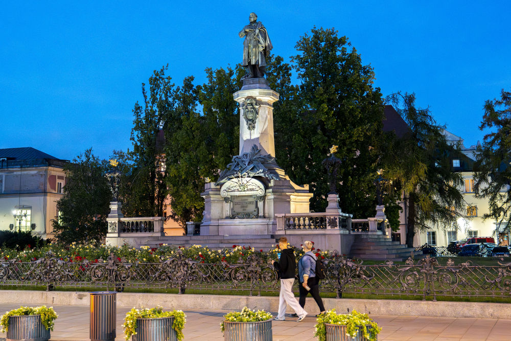 9月19日,在波蘭華沙街頭,路人經過波蘭詩人亞當·密茨凱維奇紀念碑。 新華社記者 夏原一 攝