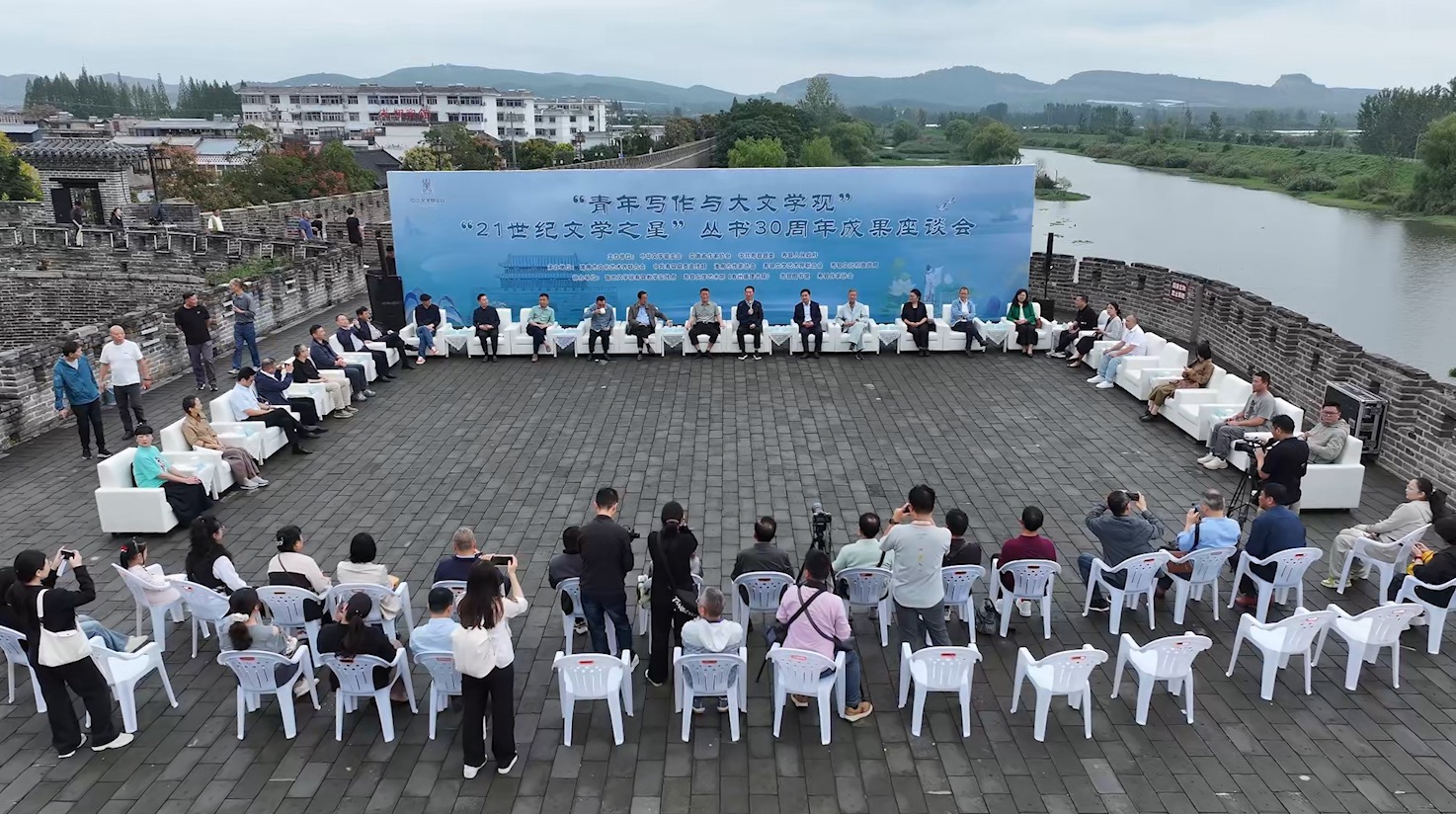 壽縣“賓陽門”城樓上,一場別開生面的文學座談會悄然拉開帷幕。“21世紀文學之星”叢書編委、往屆入選名家新卷作者等圍坐一圈,身后是奔流的淮河與蒼莽的大別山,他們探討的,是“青年寫作與大文學觀”這一既關乎初心、也指向未來的命題。座談會由施戰軍主持。