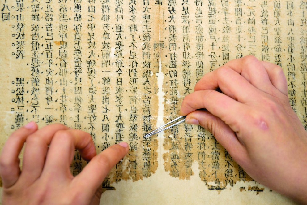 書中用大量筆墨描繪了星光熠熠的修復(fù)師群像。除了潘美娣、杜偉生,還有傳拓大師馬國(guó)慶,他能將西湖的晴、雨、霧、煙波之色,融于墨色的輕重、明暗、虛實(shí)之中;有對(duì)她影響至深的導(dǎo)師胡玉清,手把手教她如何在絮化如棉胎的《唐詩(shī)拾遺》上拼湊出指甲蓋大小的殘片,并灌輸“修合無人見,存心有天知”的職業(yè)信念;還有已故的趙嘉福先生等老一輩大師,他們將畢生絕學(xué)傾囊相授。這些事例,讓我們看到一項(xiàng)古老技藝是如何在師徒相授、口傳心授中得以薪火相傳。