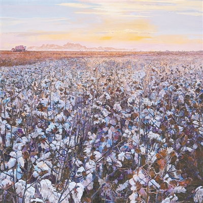 如果說(shuō)改革開(kāi)放初期的新疆油畫,多聚焦于草原牧歌、巴扎風(fēng)情等靜態(tài)抒寫,那么當(dāng)下創(chuàng)作則將視角轉(zhuǎn)向動(dòng)態(tài)發(fā)展,讓活力新疆日日新的蓬勃?dú)庀筌S然于畫布之上。付劍鋒深耕工業(yè)題材四十載,在其《逆光——國(guó)之重器系列組畫之六十六》等作品中,獨(dú)山子的石油管道在光影交織中化作鋼鐵脊梁,石油工人的身影與機(jī)械齒輪構(gòu)成“人與時(shí)代共生”的視覺(jué)史詩(shī)。馬勇《新疆棉——沃野》(見(jiàn)圖)更是以淋漓盡致的筆觸,讓機(jī)械化采棉的金色軌跡與天山雪峰形成冷暖對(duì)話,棉田如云海般翻滾,既是對(duì)“白色黃金”產(chǎn)業(yè)的禮贊,也是對(duì)科技賦能新疆農(nóng)業(yè)的生動(dòng)詮釋。這些作品不再是對(duì)現(xiàn)實(shí)場(chǎng)景的簡(jiǎn)單復(fù)刻,而是將經(jīng)濟(jì)社會(huì)發(fā)展成就轉(zhuǎn)化為可觸摸的美學(xué)符號(hào),讓觀眾在形色的視覺(jué)沖擊中感知新疆大地的歷史變遷。
