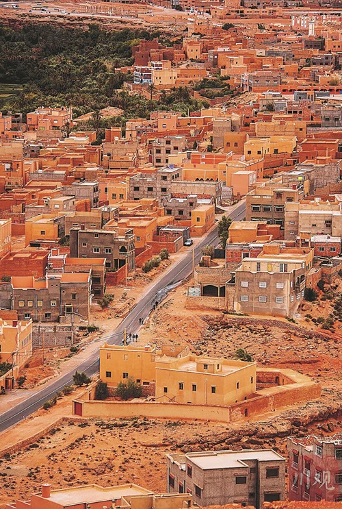 不止《卡薩布蘭卡》,很多電影都是在摩洛哥取景。前往沙漠途中經過的阿伊特本哈杜筑壘村和瓦爾扎扎特堪稱是摩洛哥的橫店。阿伊特本哈杜筑壘村于1987年被評為世界遺產,《阿拉伯的勞倫斯》《角斗士》《權力的游戲》等影視作品都曾在此拍攝。瓦爾扎扎特還有供游客參觀的電影城。當然,更吸引我的還是本地人的市井生活。在瓦爾扎扎特的酒店放好行李后,我走到城鎮中心閑逛,廣場中心圍了一圈看表演的當地人。街道不算寬闊,兩邊支起了攤位,賣甘蔗汁、烤棉花糖、炸爆米花,像極了國內縣城的春節景象。沒能在國內過年,竟然在異國他鄉收獲了相似的體驗。我買了一杯牛油果奶昔,伴著粉色的晚霞在天黑前回到酒店。