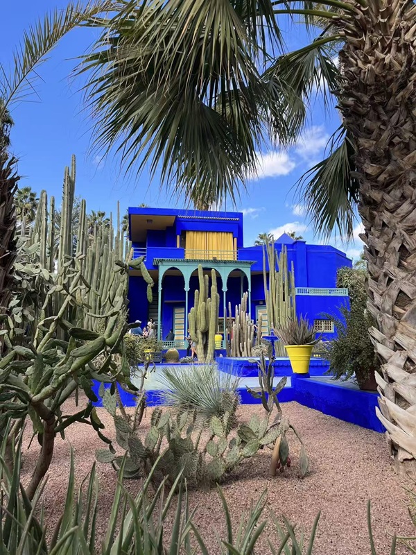 1966年,圣羅蘭和同伴貝爾熱第一次游歷摩洛哥。摩洛哥這個國家,特別是馬拉喀什這個城市,其鮮艷的色彩深深影響了圣羅蘭,為他帶去了很多靈感。當他在馬拉喀什發現了馬約爾花園時,立刻“被這片馬蒂斯的色彩與大自然的色彩相融合的綠洲所吸引”。1924年,法國畫家雅克·馬約爾購得這塊土地,并建造了一座花園。1980年,圣羅蘭和貝爾熱成為了這里的新主人,對花園進行了大規模的修復工作。畫家雅克·馬約爾的工作室被改造成一個面向公眾開放的柏柏爾博物館,展出圣羅蘭和貝爾熱的藏品。自1966年起,每年6月和12月,圣羅蘭都會在馬拉喀什度過兩周時間,設計他的高定時裝系列。2008年6月1日,圣羅蘭因腦癌去世,享年71歲。貝爾熱把圣羅蘭的骨灰埋在了馬約爾花園。距離花園不遠處的圣羅蘭博物館于2017年對外開放,和巴黎的圣羅蘭博物館遙相呼應,共同紀念這位偉大的藝術家。漫步在馬約爾花園,這種被命名為“馬約爾藍”的色調格外醒目,讓游客以為來到了色彩斑斕的夢幻天堂。