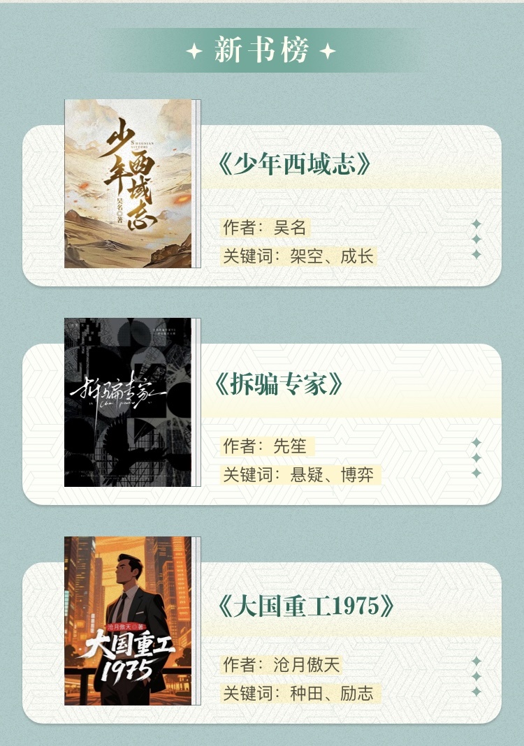 在新書(shū)榜中,三部新作對(duì)敘事與結(jié)構(gòu)實(shí)現(xiàn)了新的創(chuàng)新與突破。《少年西域志》從獨(dú)特的西域視角進(jìn)行武俠創(chuàng)作,是武俠創(chuàng)作中少有的一次突破性類(lèi)型融合實(shí)踐。《拆騙專(zhuān)家》創(chuàng)新采用雙視角敘事手法拓展刑偵文學(xué)的創(chuàng)作維度,以立體人物構(gòu)建現(xiàn)實(shí)隱喻,深刻體現(xiàn)了網(wǎng)絡(luò)文學(xué)直面現(xiàn)實(shí)、剖析人性的創(chuàng)作自覺(jué)。《大國(guó)重工1975》將“重生”敘事與工業(yè)史詩(shī)有機(jī)融合,不僅打破了網(wǎng)絡(luò)文學(xué)“輕娛樂(lè)”的固有認(rèn)知,更以民族記憶與時(shí)代發(fā)展為創(chuàng)作根基,為題材創(chuàng)新提供了兼具思想深度與文化厚度的實(shí)踐范式。
