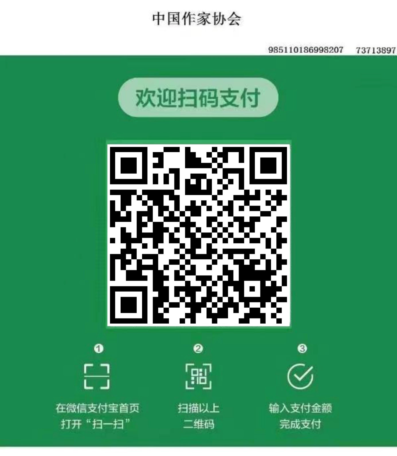 請(qǐng)掃描下方二維碼,通過微信或支付寶將會(huì)費(fèi)直接轉(zhuǎn)入中國作家協(xié)會(huì)銀行賬戶。