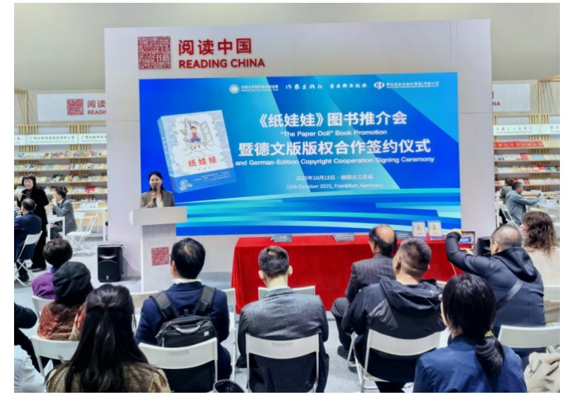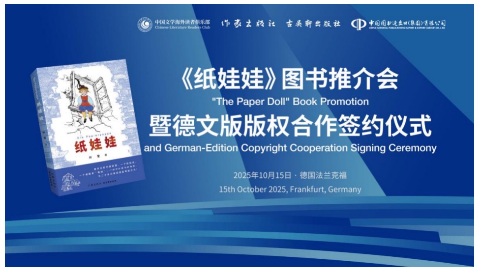近日,由中國作家協會外聯部指導,德國中國文學讀者俱樂部、作家出版社、古吳軒出版社、中國圖書進出口(集團)有限公司聯合主辦的《紙娃娃》圖書推介會暨德文版版權合作簽約儀式在德國法蘭克福書展期間舉行。本次活動以“跨越時空的和平敘事”為主題,匯聚中德出版界、作家、翻譯家及媒體代表,以兒童的視角,講述了世界反法西斯戰爭中的大愛故事。活動由旅德詩人、作家昔月主持,作家葉瑩以視頻方式參加活動。