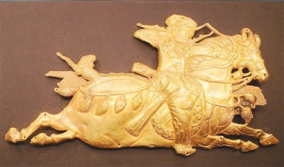 吐蕃騎射武士形飾牌造型威武,動感十足,格外引人注目。騎者纏頭巾,頭巾下方兩條發辮隨風飛舞,雙目圓瞪,嘴下有濃密的絡腮胡須;身穿緊身三角形大翻領長袍,雙手拉弓欲射,腰部系帶,其上垂掛箭囊,腰后露出刀柄。馬尾打有結扣,杏葉凌空飛動,氣勢撼人。金飾牌背面殘存帶黑漆皮的薄木片,上面有金釘將飾牌與木片定綴在一起,可知此飾牌原來應為某件木質器皿上的裝飾物。“這件飾牌的造型受到西亞薩珊王朝金銀器上的帝王狩獵圖影響,而騎士的裝束卻是吐蕃風格,體現了文化的交融。”趙婧說,青海省都蘭縣熱水墓群出土了相似的騎射形金飾片,亦為吐蕃時期的器物。