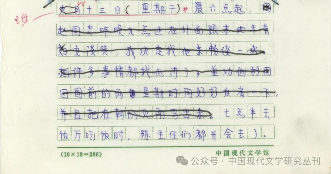 (2)1952年9月13日手稿為:“晨六點起,因趙國忠昨晚九點還在外面跟本地青年婦女談笑,我決定找他來暢談一次。把許多事情都對他講了,并勸他利用回國前的兩星期時間好好反省一下,并且把在朝的見聞寫出來?!背灞驹谛8闹袆h去句中有關趙國忠的內容,僅余“晨六點起”一句。
