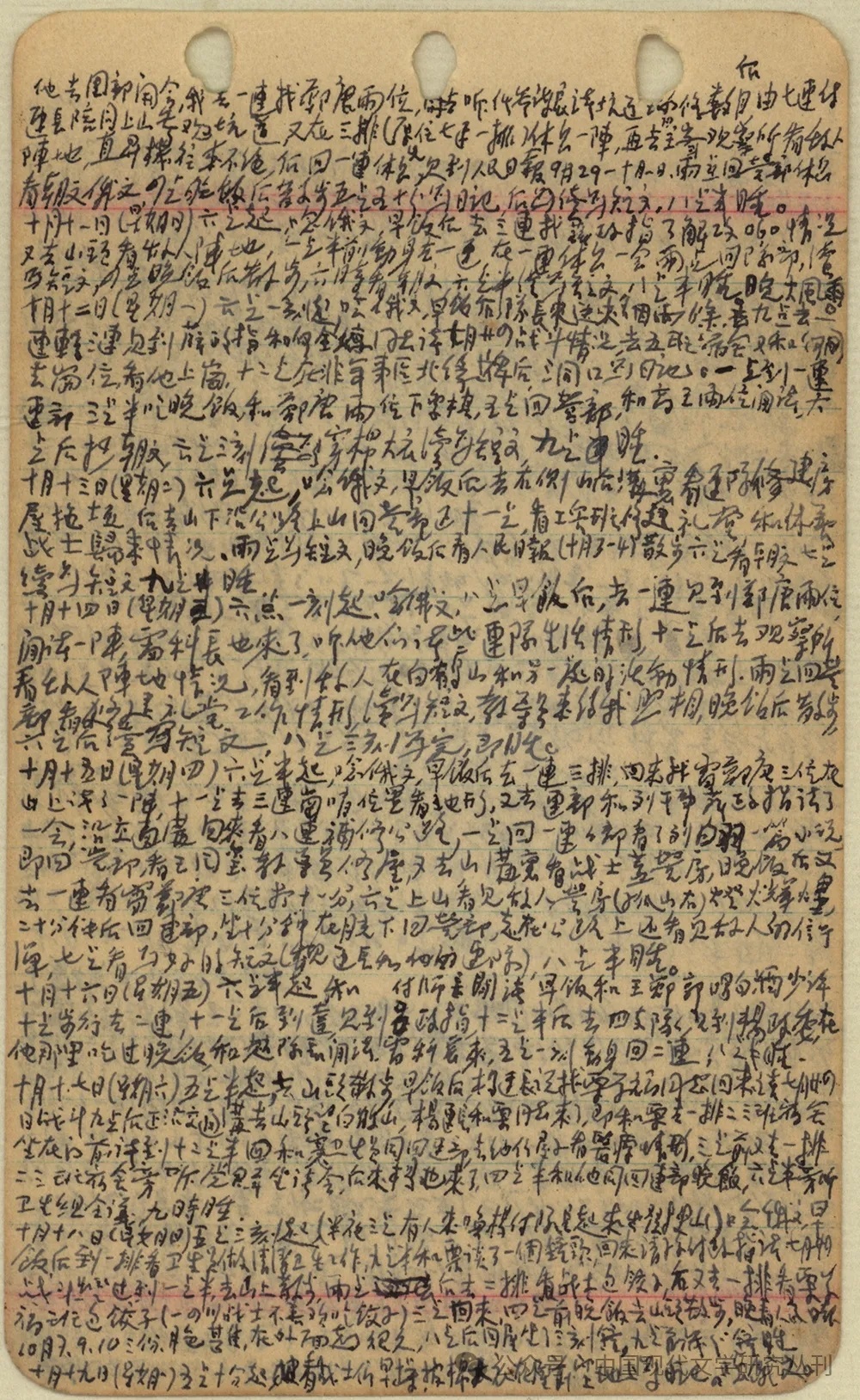 十月三日 星期五[96]晨六點起。念俄文,八點通訊員來通知去飯廳早飯。飯后在主任屋子前面平臺上曬太陽,敵機一架低飛散發傳單,正落在這個溝里。敵人進行的中秋宣傳攻勢不過如此,傳單上有母親思念兒子的圖畫和中秋拜月的畫,文字寫得不佳,頭一句是“八月中秋月光明”。十點回宿舍看書,午睡約半小時,下午正坐在屋子前面念朝文,聽水聲,看山下風景。路坎同志來通知,要我搬到余科長屋子里去,等到趙國忠打好鋪蓋卷,路科長幫我拿提包,搬到了下面余科長的屋子里面,在那里閑談了一陣,路科長去后,余科長拿來兩份《人民日報》(27、28),剛看完,就聽見號聲,便到飯廳去,人民軍金代表也來了,晚飯時喝了六杯葡萄酒,小半杯白蘭地,略有醉意。飯后和金代表、陳主任同去聯絡部坐了一陣,到晚會會場坐了一個多鐘頭,后來支持不住,就和陳主任、余科長走出來,回到住處,吐了兩口,喝兩三口茶,洗了臉即睡,時間不過七點半。