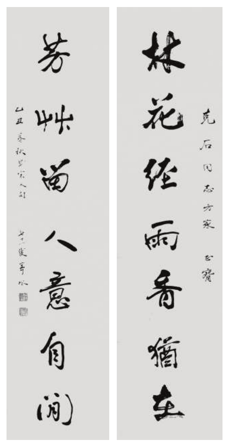 行書飄逸典雅,令人賞心悅目。同時還贈我他寫的一副對聯(lián)“林花經(jīng)雨香猶在,芳草留人意自閑”,落款是“乙丑暮秋寫宋人句七十一叟寄水”。