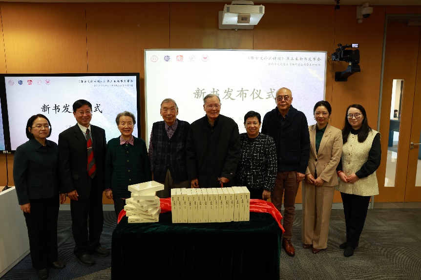 開幕式致辭結(jié)束后,張中載、劉意青、王逢振、殷企平、金莉、李鐵、 陳方、邢印姝共同為新書揭幕,并合影留念。